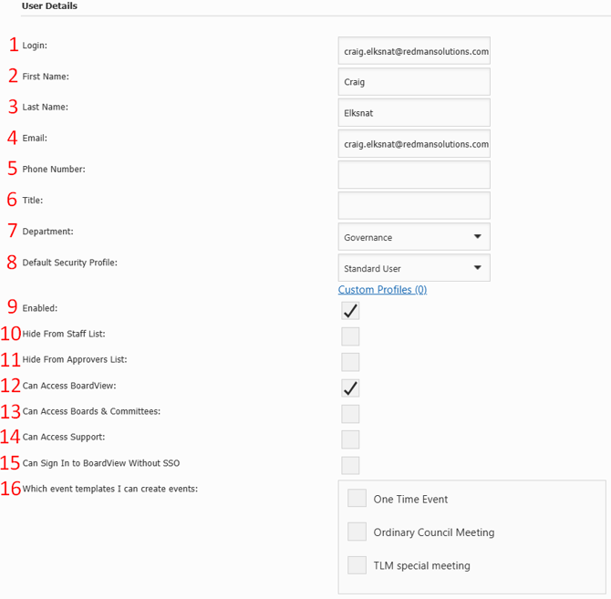 15. Can Sign In to BoardView Without SSO: Check to enable external Users, such as Committee members, to log in to BoardView without needing to be part of your organisation’s Azure Active Directory or Office 365 environment.