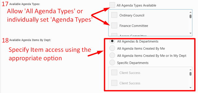 18. Available Agenda Items By Dept: Allows further restriction of accessible Items on an agenda, dependent on content the User is permitted to see.