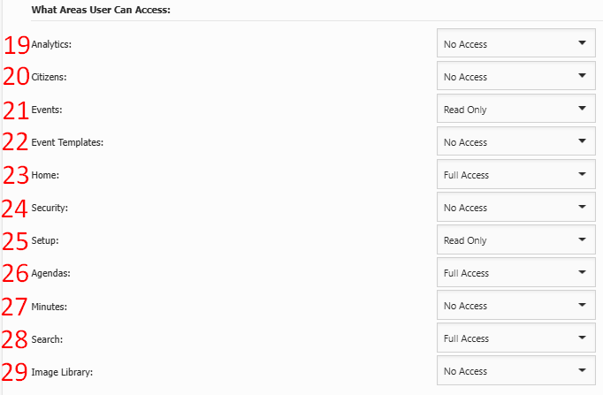 25. Setup: System Administrator access to site configuration and meeting set up options, making the User menu 'Site Settings' option available to enter.26. Agendas: Allow access to 'Meetings' main menu option. Most Admin portal Users will need access to this area to create Agendas (Meeting Admin) or add content on to an Agenda, such as an Item Report (Report Author).