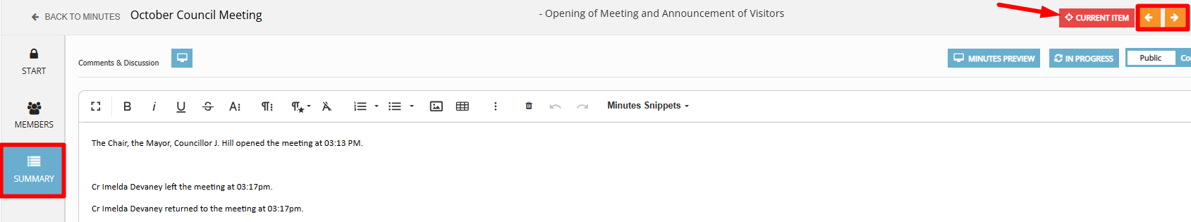 - In preparation to display the Comments & Discussion field contents, first navigate to the required Section or Item under the Minutes [SUMMARY] tab, then set to CURRENT ITEM