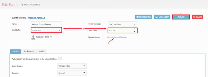If the timings for a meeting change after creation of the Agenda and related Event. See following steps a Meeting Administrator can carry out to amend the Event Date and / or Time as required.